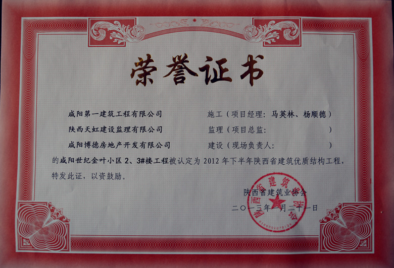 世紀金葉小區(qū)位于西咸新區(qū)灃西新城核心商圈,本公司負責建設該小區(qū)2號、3號住宅樓。項目層高27層,建筑面積3萬平方米。該項目建設過程中,先后獲得陜西省優(yōu)質結構示范工程、陜西省省級文明工地稱號,并有多項成果被授予陜西省建設工程質量管理優(yōu)秀QC小組成果一等獎。